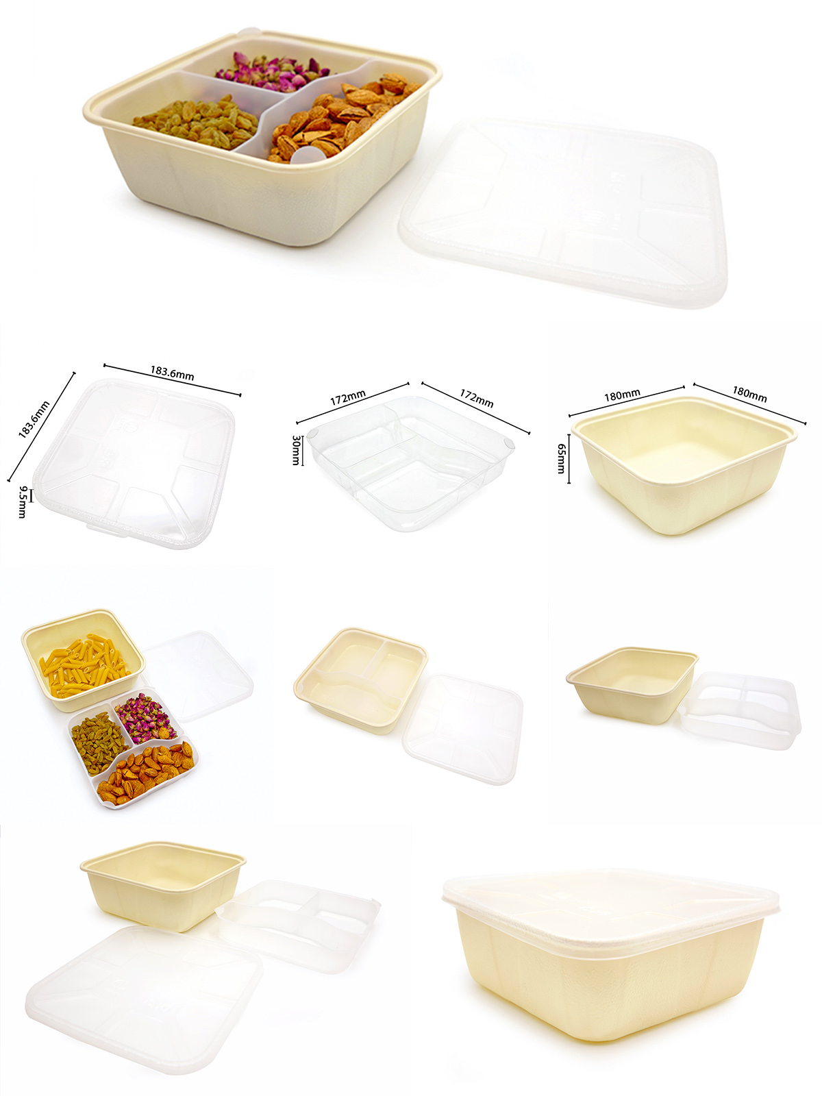 Dimensão | TAMPA: 183,6*183,6*9,5 mm BANDEJA: 180*180*65 mm BANDEJA INTERNA: 172*172*30mm |