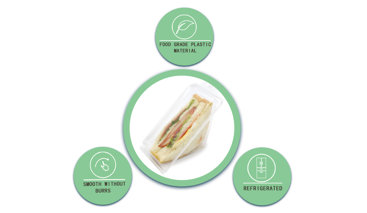 Aqui mostra um padrão de Série de caixa tipo sanduíche de plástico descartável.Com um design em forma de Triângulo, esta caixa é uma boa opção para embalagens de padaria, especialmente para sanduíches ou qualquer outro pão de padrão semelhante.
