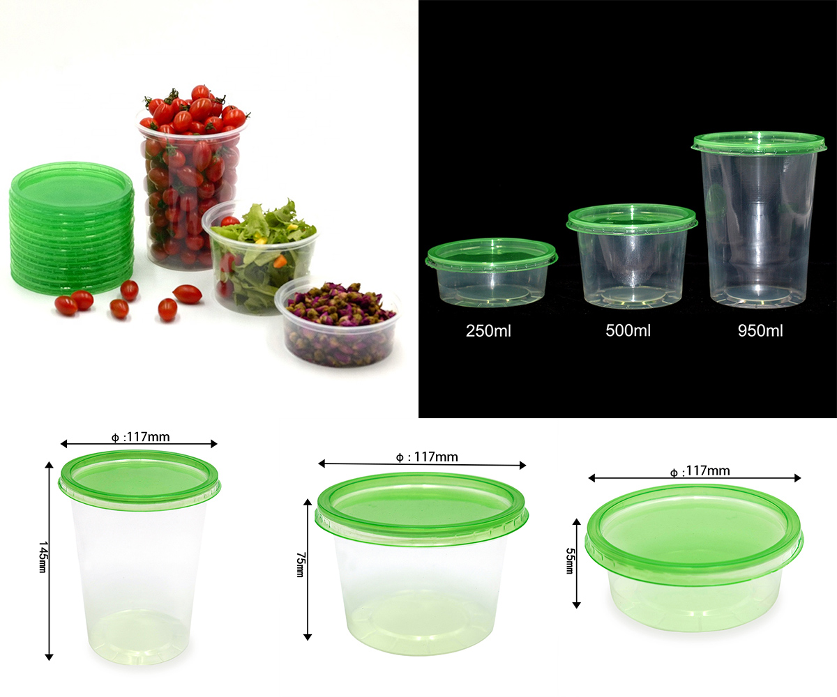 Dimensão | 250ml: Φ:117mm H:55mm 500ml: Φ:117mm H:75mm 950ml: Φ:117mm H:145mm Tampa: Φ:117mm H:5mm |